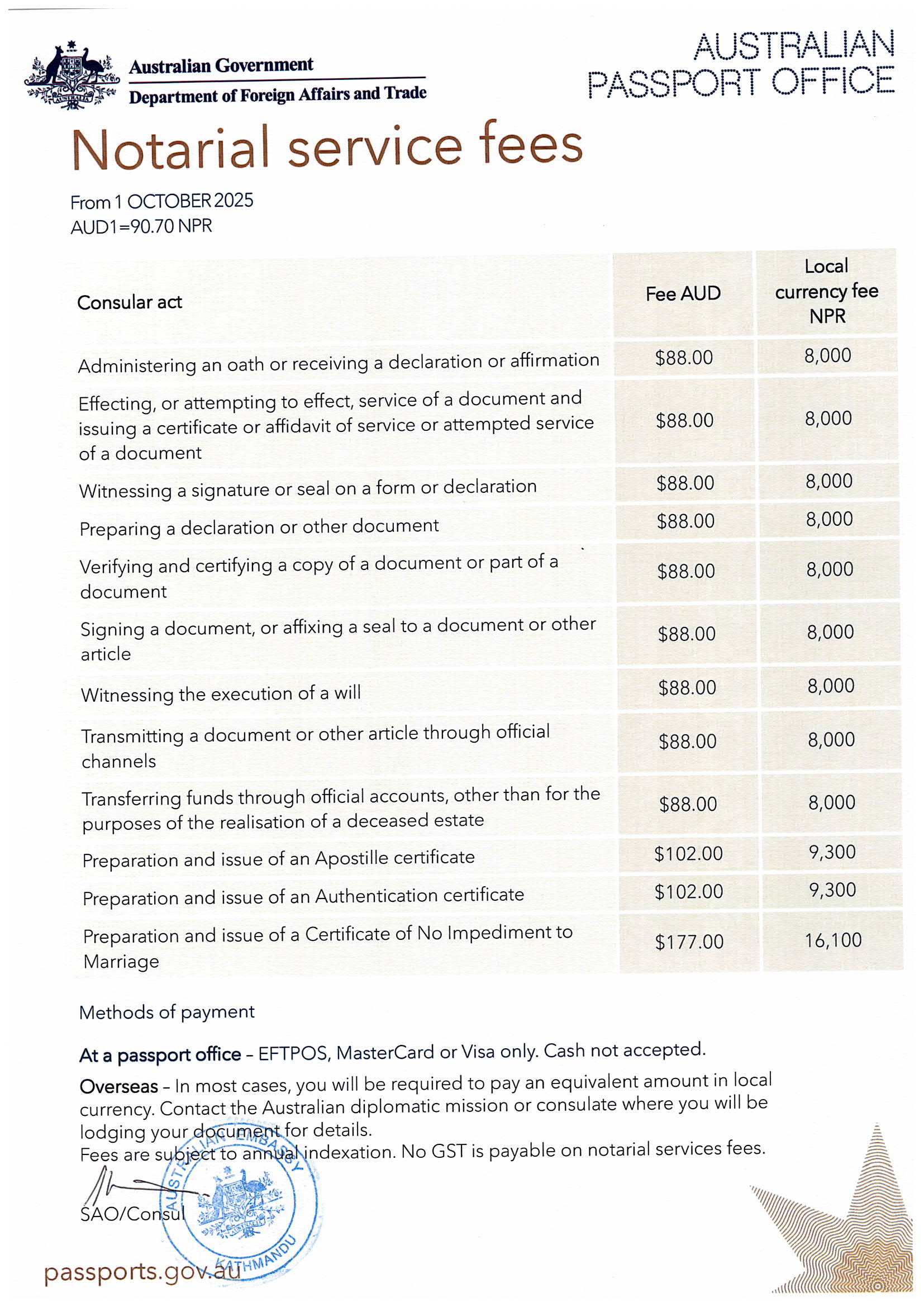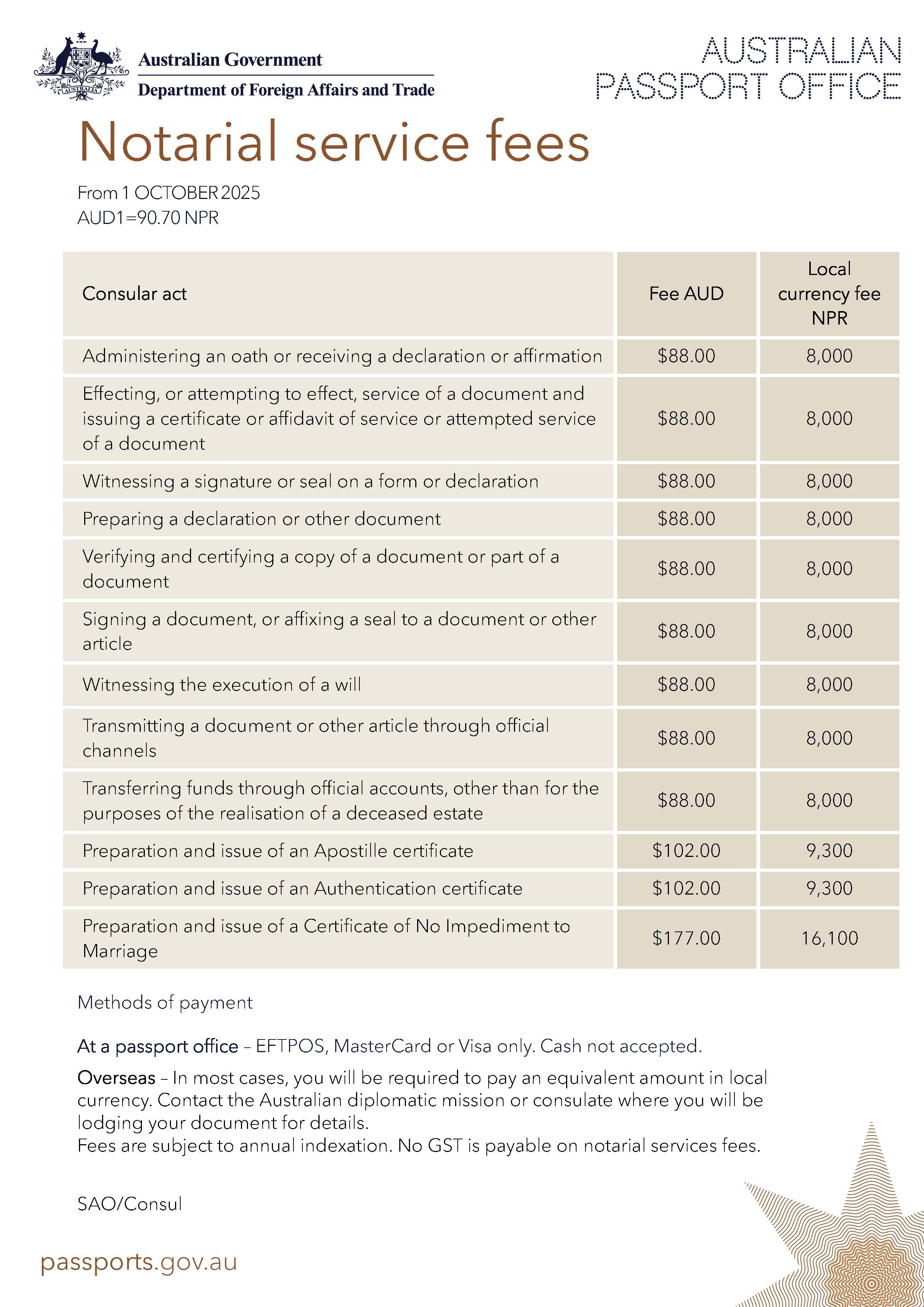 Under the Consular Fees Act 1955, the embassy is required to charge a fee for all notarial services performed (including witnessing a signature and making certified copies of documents).